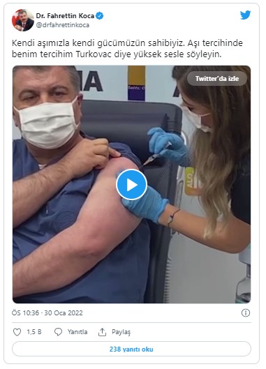 TURKOVAC aşısı olduğu görüntülere paylaşımındaki videoda yer veren Bakan Koca, "Aşı tercihinde benim tercihim TURKOVAC diye yüksek sesle söyleyin" ifadelerini videoda da tekrarladı.