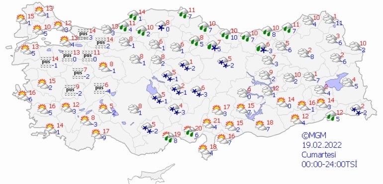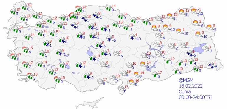 Meteoroloji Genel Müdürlüğü tarafından yapılan son değerlendirmelere göre: Yurt genelinin parçalı, yer yer çok bulutlu, bugün (Cuma) Marmara, Ege ve Batı Karadeniz ile İç Anadolu'nun kuzeybatı, Doğu Anadolu'nun güneydoğu ve Güneydoğu Anadolu'nun doğu kesimlerinin yağışlı geçeceği, yağışların genellikle yağmur ve sağanak, İç Ege, İç Anadolu ve Batı Karadeniz'in yüksek kesimlerinde önce yağmur, zamanla karla karışık yağmur ve yer yer kar şeklinde görüleceği tahmin ediliyor. Akdeniz Bölgesi'nin yüksek kesimlerinde (Toros Dağları), İç Anadolu'nun güneyinde ve doğusunda (Konya, Karaman ve Niğde'nin Toros Dağları kesimi ile Kayseri ve Sivas'ın yüksek kesimleri), Karadeniz Bölgesi'nin iç ve yüksek kesimleri ile Doğu Anadolu Bölgesi'nde yüksek kar örtüsü bulunan eğimli yerlerde çığ riski bulunmaktadır.