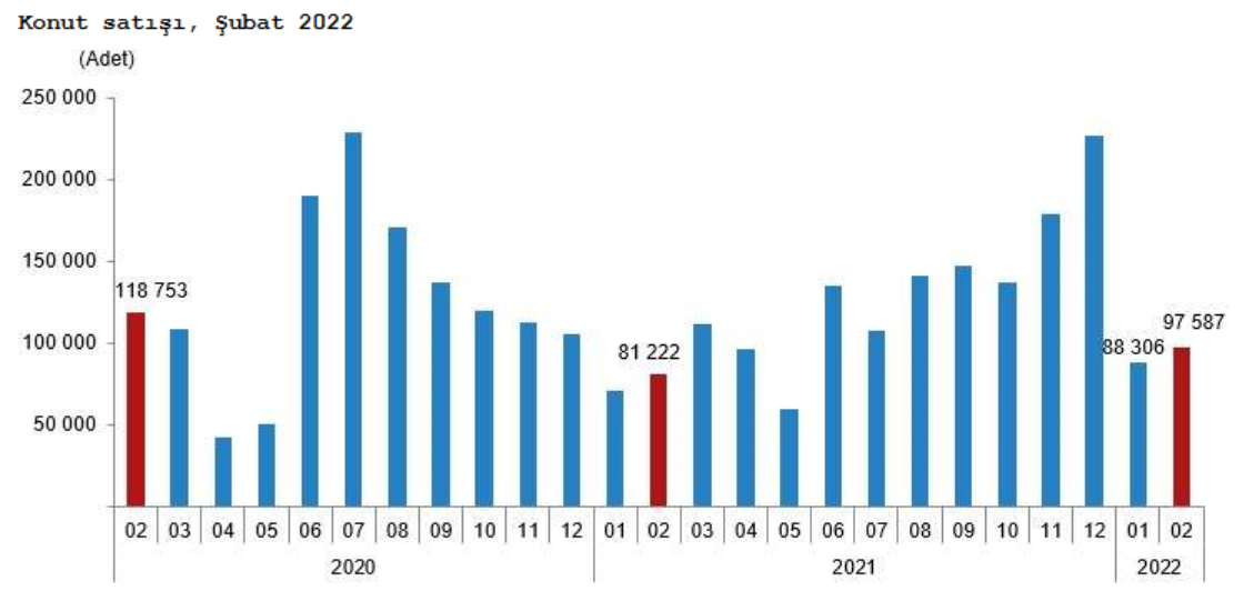 Türkiye genelinde konut satışları Şubat ayında bir önceki yılın aynı ayına göre %20,1 artarak 97 bin 587 oldu. Konut satışlarında İstanbul 18 bin 752 konut satışı ve %19,2 ile en yüksek paya sahip oldu. Satış sayılarına göre İstanbul'u 8 bin 464 konut satışı ve %8,7 pay ile Ankara, 5 bin 575 konut satışı ve %5,7 pay ile İzmir izledi. Konut satış sayısının en az olduğu iller sırasıyla 23 konut ile Ardahan, 40 konut ile Hakkari ve 47 konut ile Bayburt oldu.