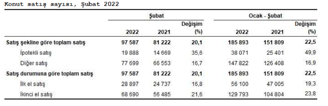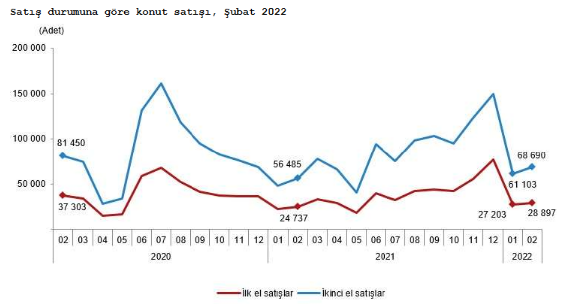 Türkiye genelinde ikinci el konut satışları Şubat ayında bir önceki yılın aynı ayına göre %21,6 artış göstererek 68 bin 690 oldu. Toplam konut satışları içinde ikinci el konut satışının payı %70,4 oldu. İkinci el konut satışları Ocak-Şubat döneminde ise bir önceki yılın aynı dönemine göre %23,8 artışla 129 bin 793 olarak gerçekleşti.