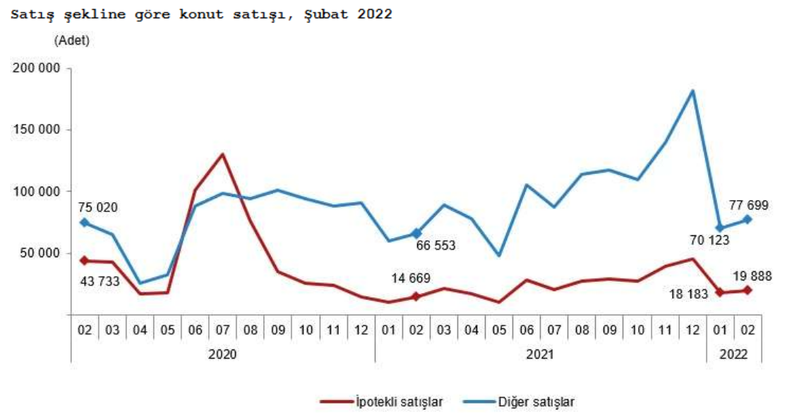Türkiye genelinde diğer konut satışları Şubat ayında bir önceki yılın aynı ayına göre %16,7 artarak 77 bin 699 oldu. Toplam konut satışları içinde diğer satışların payı %79,6 olarak gerçekleşti. Ocak-Şubat döneminde gerçekleşen diğer konut satışları ise bir önceki yılın aynı dönemine göre %16,9 artışla 147 bin 822 oldu.