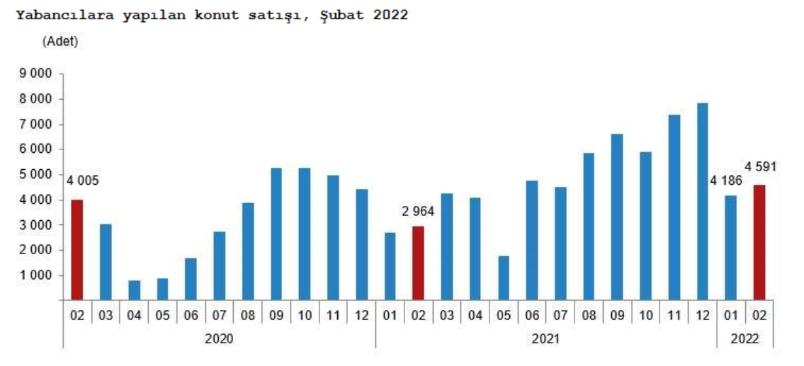 Yabancılara yapılan konut satışları Şubat ayında bir önceki yılın aynı ayına göre %54,9 artarak 4 bin 591 oldu. Şubat ayında toplam konut satışları içinde yabancılara yapılan konut satışının payı %4,7 oldu. Yabancılara yapılan konut satışlarında ilk sırayı bin 958 konut satışı ile İstanbul aldı. İstanbul'u sırasıyla bin 99 konut satışı ile Antalya, 288 konut satışı ile Ankara izledi.
