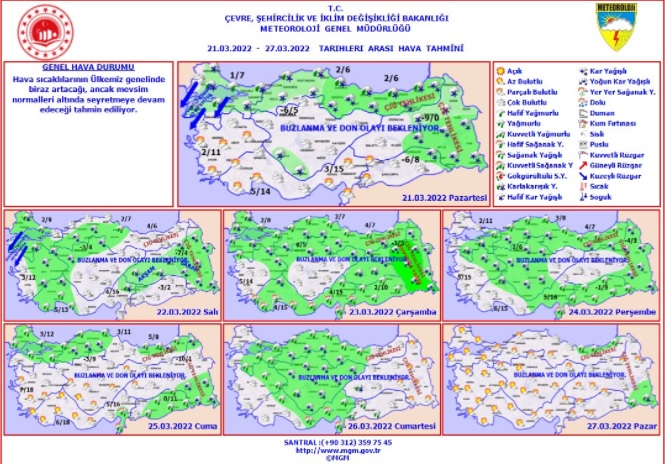 Meteoroloji haftalık hava durumu tahmin raporunu açıkladı. Kurumun sosyal medya hesabından yapılan açıklamada, “Hava sıcaklıklarının ülkemiz genelinde biraz artacağı ancak mevsim normalleri altında seyretmeye devam edeceği tahmin ediliyor” ifadeleri yer aldı.
