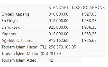 KMKTP'de, altında gerçekleşen toplam işlem hacmi 258 milyon 379 bin 105,05 lira, işlem miktarı ise 281,79 kilogram oldu.