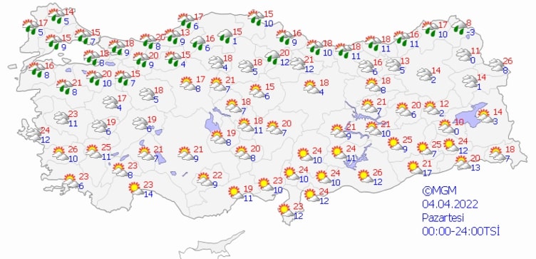 Meteoroloji Genel Müdürlüğü tarafından yapılan son değerlendirmelere göre; kuzey ve iç kesimlerinin parçalı ve çok bulutlu, Marmara, Batı Karadeniz, Orta ve Doğu Karadeniz kıyıları ile Artvin ve Ardahan çevrelerinin yağmur ve sağanak yağışlı, diğer yerlerin az bulutlu ve açık geçeceği tahmin ediliyor.