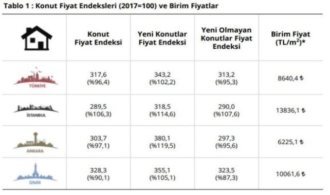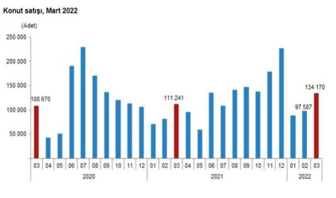 TÜİK'in son verilerine göre, Türkiye genelinde konut satışları mart ayında bir önceki yılın aynı ayına göre yüzde 20.6 artarak 134 bin 170 olurken, Ocak-Mart döneminde ise bir önceki yılın aynı dönemine göre yüzde 21.7 artışla 320 bin 63 olarak gerçekleşti. Konut satışlarında İstanbul 23 bin 974 konut satışı ve yüzde 17.9 ile ilk sırada yer aldı. İstanbul'u 12 bin 609 konut satışı ile Ankara ve 8 bin 51 konut satışı ile İzmir izledi. Konut satışlarındaki artışları fiyatlar da izledi. TCMB tarafından yayımlanan verilere göre konut fiyat endeksi şubat ayında yıllık yüzde 96,4 oranında artarak tarihi bir artış kaydetti. Türkiye genelinde birim konut fiyatları yıllık yüzde 113,2 artışla metrekare başına 8 bin 640 TL seviyelerine ulaşırken, İstanbul'da şubatta metrekare birim fiyatı 13 bin 836 lira oldu.