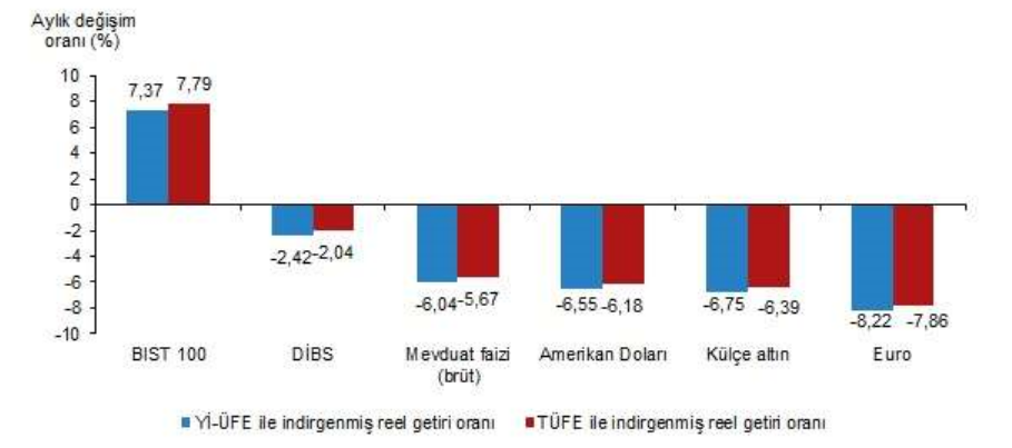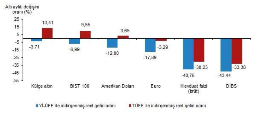 Yİ-ÜFE ile indirgendiğinde; yatırım araçlarından Devlet İç Borçlanma Senetleri (DİBS) %2,42, mevduat faizi (brüt) %6,04, Amerikan doları %6,55, külçe altın %6,75 ve Euro %8,22 oranlarında yatırımcısına kaybettirdi. TÜFE ile indirgendiğinde DİBS %2,04, mevduat faizi (brüt) %5,67, Amerikan doları %6,18, külçe altın %6,39 ve Euro %7,86 oranlarında yatırımcısına kaybettirdi.