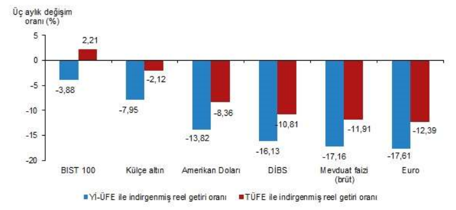 BIST 100 endeksi, üç aylık değerlendirmede; TÜFE ile indirgendiğinde %2,21 oranında yatırımcısına en yüksek reel getiri sağlarken; Yİ-ÜFE ile indirgendiğinde ise %3,88 oranında yatırımcısına kaybettirmiştir. Euro, Yİ-ÜFE ile indirgendiğinde %17,61, TÜFE ile indirgendiğinde ise %12,39 oranında yatırımcısına en çok kaybettiren yatırım aracı oldu.