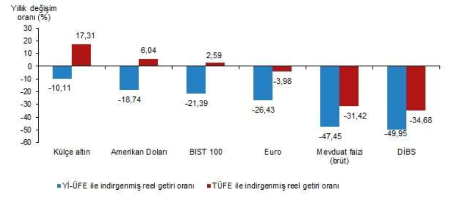 Yıllık değerlendirmede, Yİ-ÜFE ile indirgendiğinde; yatırım araçlarından Amerikan doları %18,74, BIST 100 endeksi %21,39, Euro %26,43, mevduat faizi (brüt) %47,45 ve DİBS %49,95 oranlarında yatırımcısına kaybettirdi. TÜFE ile indirgendiğinde ise Amerikan doları %6,04 ve BIST 100 endeksi %2,59 oranlarında yatırımcısına kazandırırken; Euro %3,98, mevduat faizi (brüt) %31,42 ve DİBS %34,68 oranlarında yatırımcısına kaybettirdi.