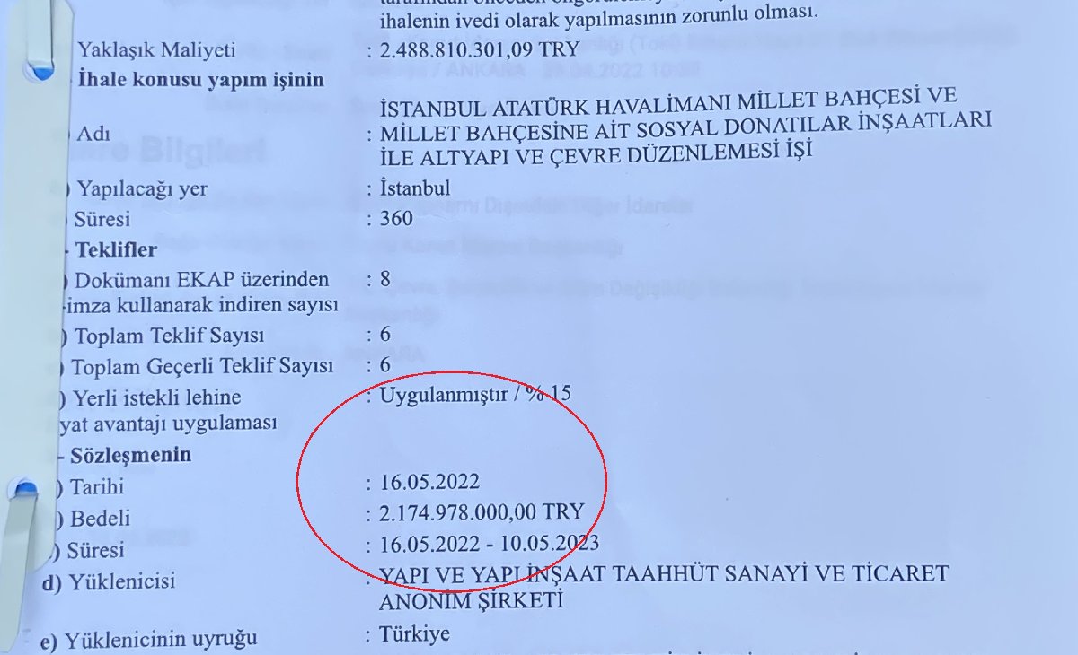 İmamoğlu’nun açıkladığı Kamu İhale Kurumu kayıtlarındaki belgeye göre, tam adı İstanbul Atatürk Havalimanı Millet Bahçesi ve Millet Bahçesi’ne Ait Sosyal Donatılar İnşaatları İle Altyapı ve Çevre Düzenlemesi İşi sözleşmenin imzalandığı gün 16 Mayıs 2022 günü başladı ve 360 günde 10 Mayıs 2023 tarihinde tamamlanması öngörüldü.