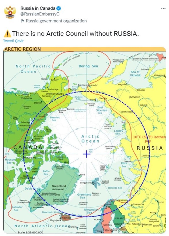Rusya'nın Kanada Büyükelçiliği, Kuzey Kutbu'nun haritasını paylaşarak “Rusya'sız Arktik Konseyi olmaz” mesajını paylaştı.
