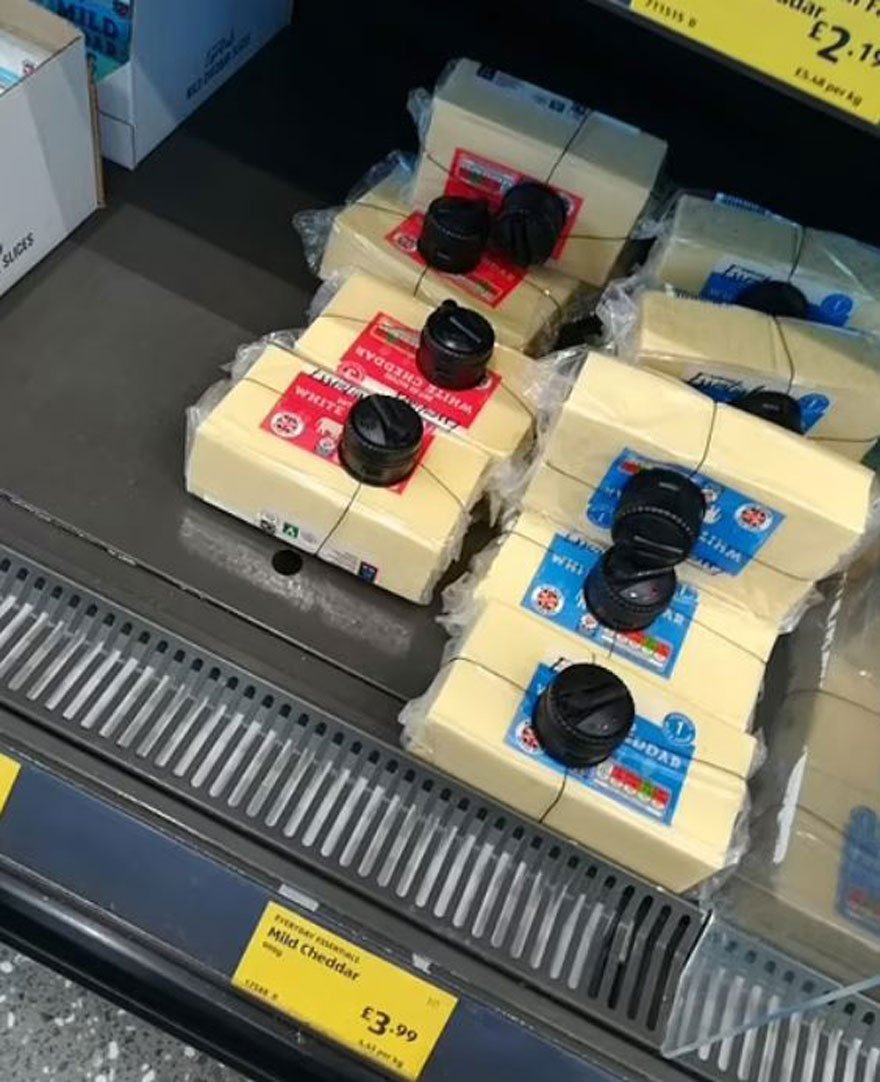 İngiltere’nin çok okunan gazetelerinden Daily Mail’de yer alan haberde ve görsellerde, bazı süpermarket zincirlerinin peynir, et, tereyağı ve bebek maması gibi ürünlere elektronik barkod yapıştırıldığı ya da elektronik kilit takıldığı görülüyor.