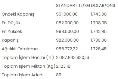 KMKTP'de, altında gerçekleşen toplam işlem hacmi 2 milyar 87 milyon 843 bin 930,16 lira, işlem miktarı ise 2.123,18 kilogram oldu.
