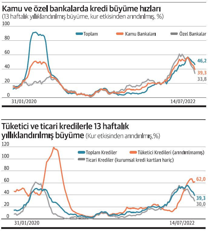 Tüketici kredisinde 13 haftalık büyüme hızı yüzde 62 Merkez Bankası verilerine göre TL tüketici kredi faizleri ortalama yüzde 33,72’ye çıktı. Politika faiziyle arasındaki makas 20 puana işaret ediyor. Faizlerde yükseliş ise haziran başından bu yana devreye alınan önlemler sonrası hızlandı. Haziran başında TL tüketici kredi faizi yüzde 30,32 idi. 1.5 ayda 5.1 puanlık yükseliş yaşandı. Faizler hızlı yükselirken tüketici kredileri büyüme hızında dalgalı bir seyir yaşandı. Haziran başında tüketici kredilerinde 13 haftalık yıllıklandırılmış arındırılmamış büyüme yüzde 55,8 iken 15 Temmuz haftasında yüzde 62'ye geldi. Merkez Bankası’nın ve BDDK’nın bankacılık sektöründe en fazla önlemin getirildiği ticari kredi faizinde ise ortalama yüzde 30,66 faizler bulunuyor. Rotatif kredi faizleri ise yüzde 50’nin üzerinde seyrediyor. Bu da yine politika faizi ile arasında 16.66 puanlık farka işaret ederken ticari kredi büyüme hızında gözle görülür seviyede ivme kaybı var. 13 haftalık yıllıklandırılmış kur etkisinden arındırılmış kurumsal kredi kartları hariç ticari kredi büyüme hızı 15 Temmuz haftası itibariyle yüzde 30’a indi. Haziran başında yüzde 49,3 idi. Ticari kredi büyümesi hız kesince toplam kredi büyümesi de yavaşladı. 13 haftalık yıllıklandırılmış ve kur etkisinden arındırılmış toplam kredi büyümesi yüzde 39,3’e indi. Merkez Bankası son Para Politikası Kurulu metninde politika önlemlerinin kredi kanalından da uygulanacağını ifade etti. Bu krediler üzerinde yeni önlemler görüleceğinin işareti. Uzmanlar alınabilecek önlemlerin kredi faizlerindeki yükseliş trendini devam ettireceğini vurguladı.