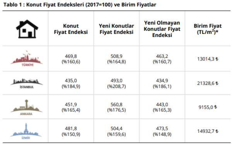 İstanbul, Ankara ve İzmir’in konut fiyat endekslerindeki gelişmeler değerlendirildiğinde, 2022 yılı Haziran ayında bir önceki aya göre, sırasıyla 9,7, 9,3 ve 8,1 oranlarında artış gözlendi. Endeks değerleri bir önceki yılın aynı ayına göre, İstanbul, Ankara ve İzmir’de sırasıyla yüzde 184,9, 165,4 ve 150,9 oranlarında artış gösterdi.