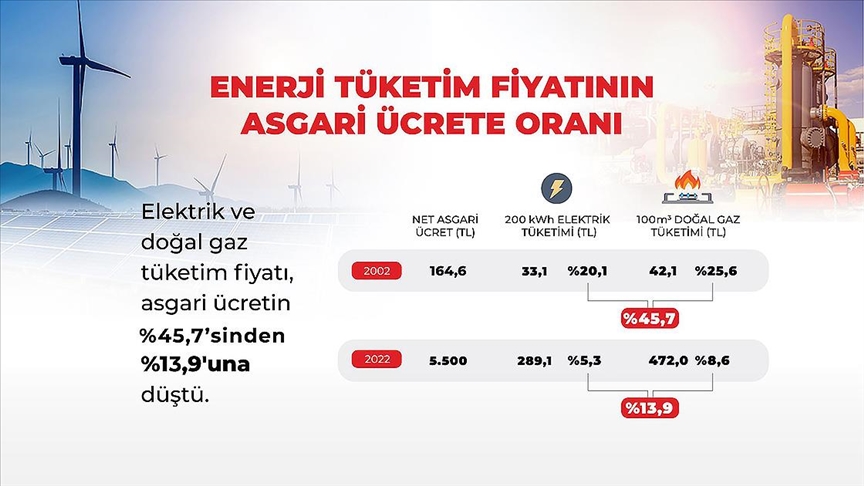 "2002'de net asgari ücret 164,6 lira, 200 kilovatsaat elektrik tüketimi 33,1 lira, bu tüketimin asgari ücret içindeki payı yüzde 20,1, 100 metreküp doğal gaz 42,1 lira, asgari ücret içindeki payı yüzde 25,6. 2022'de net asgari ücret 5 bin 500 lira, 200 kilovatsaat elektrik tüketimi 289,1 lira, asgari ücret içindeki payı yüzde 5,3, 100 metreküp doğal gaz 472 lira, asgari ücret içindeki payı yüzde 8,6."
