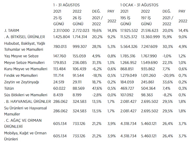 TİM verilerine göre sektörel bazda 2021 ve 2022'nin ağustos ayı ve son 12 aylık ihracat rakamları, yüzdesel değişimler ve toplam içindeki paylar şöyle (bin dolar):
