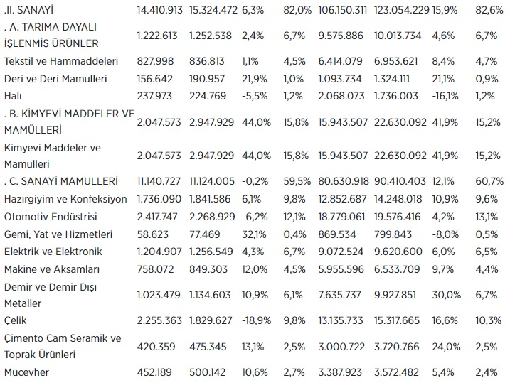 Bu dönemde toplam ihracatın yüzde 14,8'ini oluşturan tarım grubunda yüzde 19,6 yükselişle 2 milyar 772 milyon dolarlık, toplam ihracattan yüzde 3,2 pay alan madencilik grubunda ise yüzde 18'lik artışla 600 milyon 684 bin dolarlık dış satım oldu.