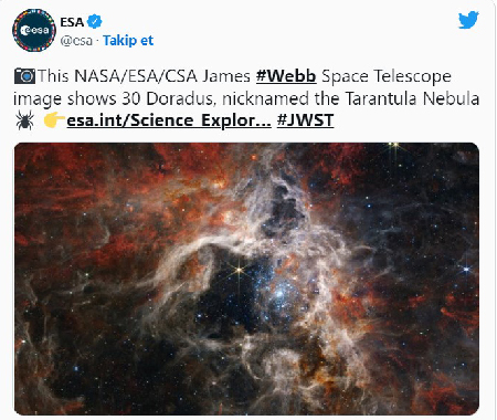 Independent Türkçe'deki habere göre; NASA, teleskobun yakın-kızılötesi kamerası sayesinde bulutsudaki kozmik toz yüzünden daha önce görülmemiş on binlerce genç yıldızın incelendiğini bildirdi.