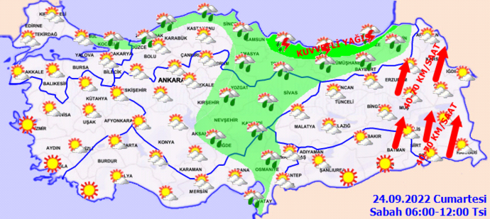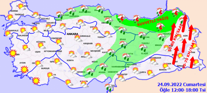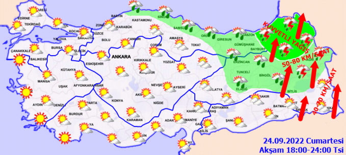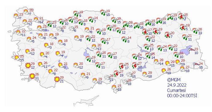 Meteoroloji Genel Müdürlüğü tarafından yapılan son değerlendirmelere göre ülkemizin kuzey, iç ve doğu kesimlerinin parçalı, yer yer çok bulutlu, İstanbul'un Anadolu yakası, Kocaeli çevreleri, Sakarya'nın kuzeyi, İç Anadolu’nun doğusu, Karadeniz Bölgesi (Bolu hariç), Doğu Anadolu (Hakkari hariç), Osmaniye, Kahramanmaraş ve Adıyaman çevreleri ile Doğu Akdeniz'in doğu Toroslar mevkii, Adana’nın kuzey çevreleri ve Hatay’ın kıyı kesimlerinin sağanak ve gök gürültülü sağanak yağışlı geçeceği tahmin ediliyor.