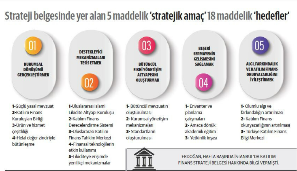Dünyada İslami Finans olarak adlandırılan, Türkiye’de ise artık Katılım Finans olarak anılacak olan “faizsiz finans sisteminin geliştirilmesi, finansman sistemi içindeki payının artması ve reel sektöre daha fazla katkı sağlaması” amacıyla hazırlanan Katılım Finans Strateji Belgesi (2022-2025) açıklandı. Cumhurbaşkanlığı Finans Ofisi tarafından açıklanan 165 sayfalık belgede, 5 temel amaç, 18 hedef ve 84 eylem bulunuyor.
