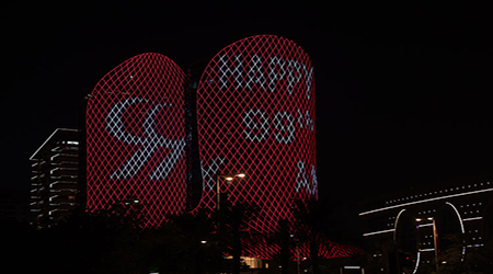 Türk bayraklarının üzerine ayrıca "Türkiye Cumhuriyetinin 99. yılını kutluyoruz" ve "Mutlu yıl dönümleri" yazısı yazıldı; Katar Emiri Şeyh Temim bin Hamed Al Sani ile Cumhurbaşkanı Recep Tayyip Erdoğan'ın fotoğrafları yansıtıldı.