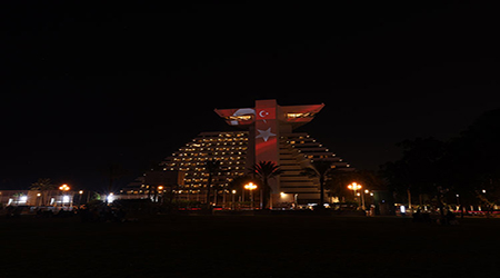 Katar'ın başkenti Doha'daki 6 binanın dış cephesine, 29 Ekim Cumhuriyet Bayramı sebebiyle Türk bayrağı yansıtıldı.