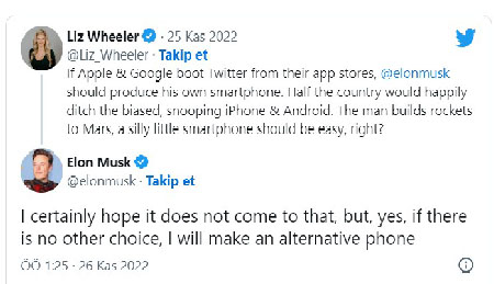 Wheeler attığı tweet'te "Apple ve Google uygulama mağazalarından Twitter'ı kaldırırsa, Elon Musk kendi akıllı telefonunu üretmeli. Ülkenin yarısı taraflı ve gözetleme yapan iPhone'la Android'i seve seve terk eder. Bu adam Mars'a giden roketler yapıyor. Saçma bir küçük akıllı telefon kolay olmalı değil mi?" dedi.