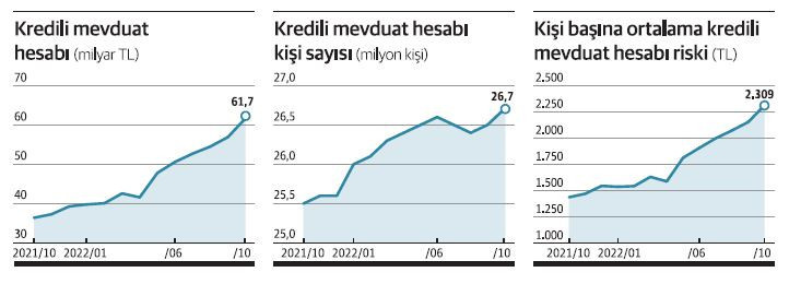 Türkiye Bankalar Birliği ekim ayı bülteni ağustostan itibaren politika faizi indirimleri sonrasında kredili mevduat hesabı kullanımını arttırdığını ortaya koydu. Ekim itibariyle kredili mevduat hesabı kişi sayısı 26.7 milyona yükselirken kişi başı ortalama kredili mevduat hesabı riski ise 2 bin 309 liraya çıktı. Temmuzda bu rakam bin 990 lirayken ağustosta 2 bini aştı. KMH hesabı bakiyesi de ekimde 61.7 milyar liraya yükselerek zirvesi gördü. KMH bakiyesindeki artış geçen yılın aynı ayına göre yüzde 69,5, yılbaşına göre ise yüzde 55 olarak hesaplandı.