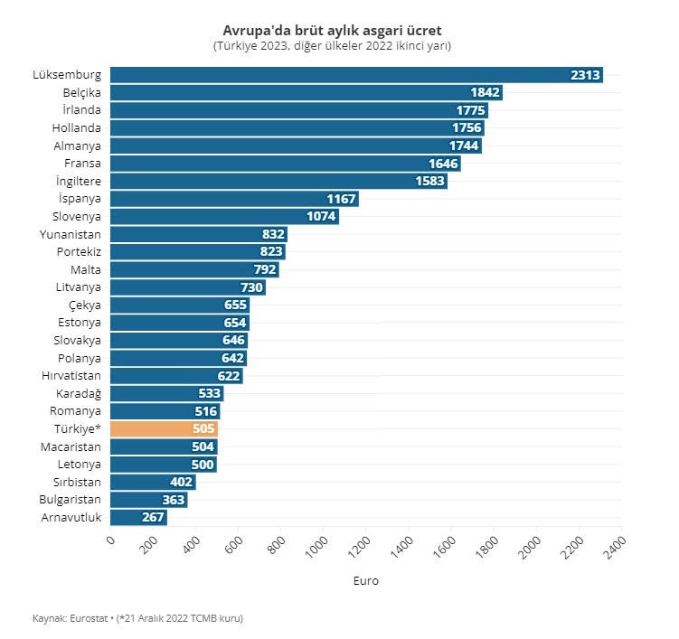 Türkiye Cumhuriyet Merkez Bankası’nın (TCMB) 21 Aralık 2022 kuru itibariyle 2023 yılında brüt asgari ücret 505 euro oldu. Euro bazında asgari ücret 2022’nin ikinci yarısına göre yüzde 35 yükselmiş oldu. Gelen zam ile birlikte 26 Avrupa ülkesi içinde Türkiye 24 sıradan 21. sıraya yükseldi.