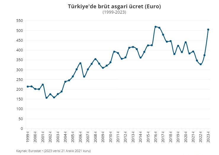 1999’dan bu yana euro bazında brüt asgari ücret daha önce sadece iki kez 500 euro bandını aşmıştı. 2016 yılında görülen 519 ve 514 eurodan sonra 2023 ilk yarısı en yüksek üçüncü seviye olarak kayıtlara geçti.