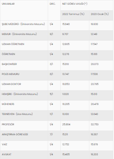 Söz konusu artışlar neticesinde Ocak 2023 dönemi itibarıyla bazı kamu görevlilerinin net görev aylıkları şu şekilde belirlendi: