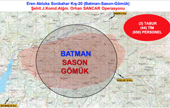 Terör örgütü PKK'yı ülke gündeminden çıkarmak ve bölgede barındığı değerlendirilen teröristleri etkisiz hale getirmek maksadıyla Batman'da "Eren Abluka Sonbahar Kış-20 (Batman/Sason-Gömük) Şehit Jandarma Komando Asteğmen Orhan Sancar" operasyonu başlatıldı.