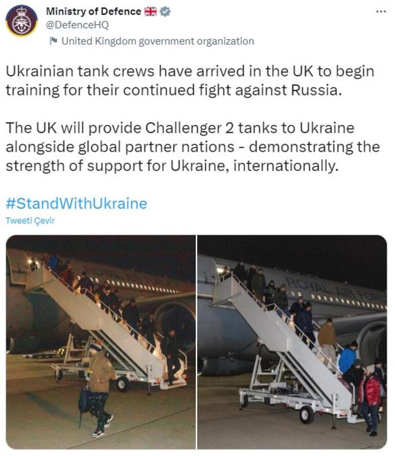 İngiltere Savunma Bakanlığı’ndan yapılan açıklamada, “Ukraynalı tankçı birlikleri, Rusya'ya karşı devam eden mücadeleleri için eğitime başlamak üzere İngiltere'ye geldi. Birleşik Krallık, küresel ortak ülkelerle birlikte Ukrayna'ya Challenger 2 tankları sağlayacak ve bu da Ukrayna'ya uluslararası desteğin gücünü gösterecek” denildi.