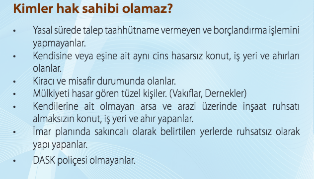 Kiracılar, vakıf ve dernekler, kaçak yapılar, imar planında sakıncalı yerlere ruhsatsız olarak yapılmış yapıların sahipleri, DASK poliçesi olmayanlar hak sahibi olamıyor.