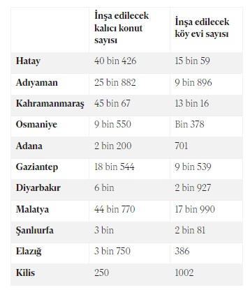 Hangi şehirde kaç kalıcı konut ve köy evi yapılacağı ile ilgili sayılar ise şu şekilde:
