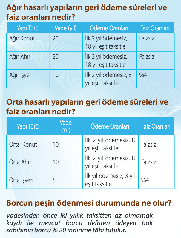 AFAD'ın sitesinde yer alan bilgiye göre ağır ve orta hasarlı yapıların geri ödeme süreleri ve faizleri şu şekilde: