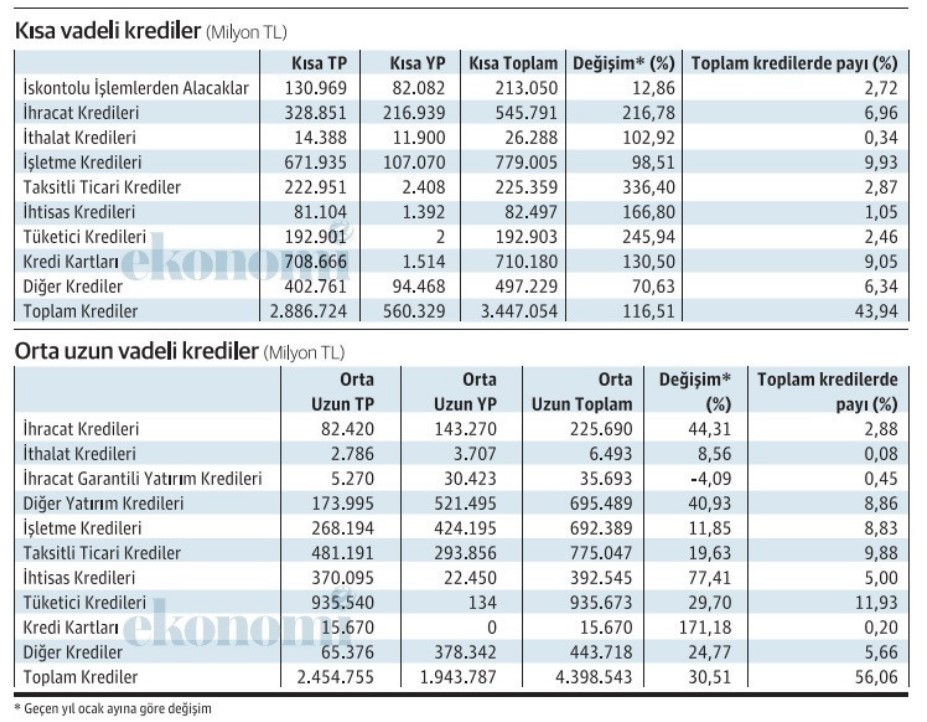 BDDK ocak ayı verilerine göre bu yıl ocakta orta –uzun vadeli işletme kredilerinin toplam krediler içindeki oranı yüzde 12,5'ten yüzde 8,83'e indi, taksitli ticari kredilerin de geçen yıl ocakta yüzde 13,06 olan oranı yüzde 9,88'e geriledi. Kısa vadeli işletme kredileri geçen yıl ocak ayına göre yüzde 98,51 artış gösterirken orta –uzun vadeli işletme kredilerinin büyümesi yüzde 11,85’te kaldı. Taksitli ticari krediler de kısa vadede yüzde 336,4’lük bir büyümeye imza atarken orta-uzun vadeli taksitli ticari kredilerin geçen yıla göre büyümesi 19,63 olabildi. İhracat kredileri kısa vadede yüzde 216,8 arttı, orta-uzun vadeli ihracat kredileri yüzde 44,3 artışa rağmen toplam krediler içindeki payı azaldı. Verilerden yapılan hesaplamaya göre kısa vadeli ihracat kredilerinin toplam krediler içindeki payı geçen yıl ocaktaki yüzde 3,47’den yüzde 6,96’ya yükselirken, orta-uzun vadeli ihracat kredilerinin toplam kredilerde içindeki oranı yüzde 3,15’ten yüzde 2,88’e indi.