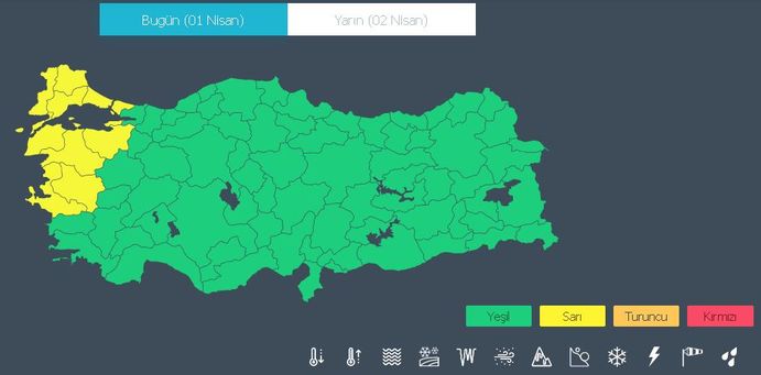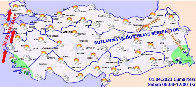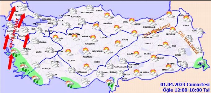 Meteoroloji Genel Müdürlüğü'nden yapılan açıklamada, bugün Marmara ve Ege bölgelerinde rüzgarın, güney ve güneybatı (lodos) yönlerden kuvvetli, İstanbul, Tekirdağ, Kırklareli, Edirne, Çanakkale, Balıkesir, Bursa, İzmir ve Manisa çevrelerinde kuvvetli yer yer hamleli fırtına (50-70 km/saat, yüksek kesimlerde 70-80 km/saat) şeklinde eseceği duyuruldu.