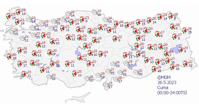 İZMİR: 26, Parçalı ve çok bulutlu, öğle saatlerinden sonra sağanak ve gök gürültülü sağanak yağışlı.