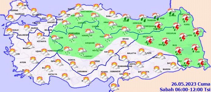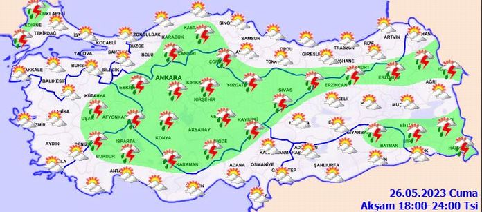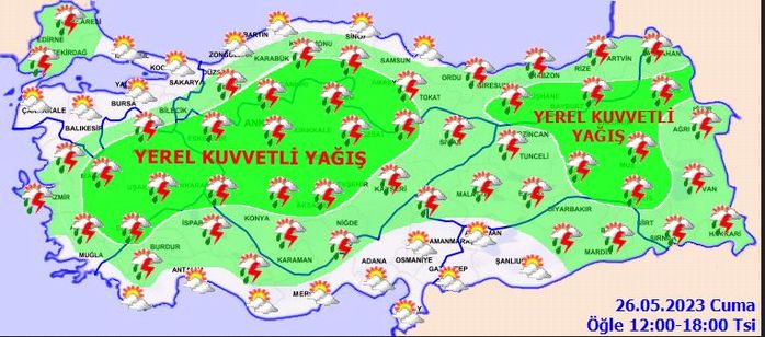 Yağışların; öğle saatlerinden itibaren İç Ege, İç Anadolu'nun kuzeybatısı, Doğu Karadeniz'in iç kesimleri ile Aksaray, Nevşehir, Yozgat, Erzurum, Kars, Bingöl, Muş ve Bitlis çevrelerinde yerel kuvvetli olması bekleniyor.