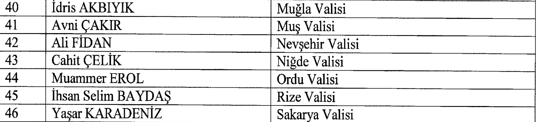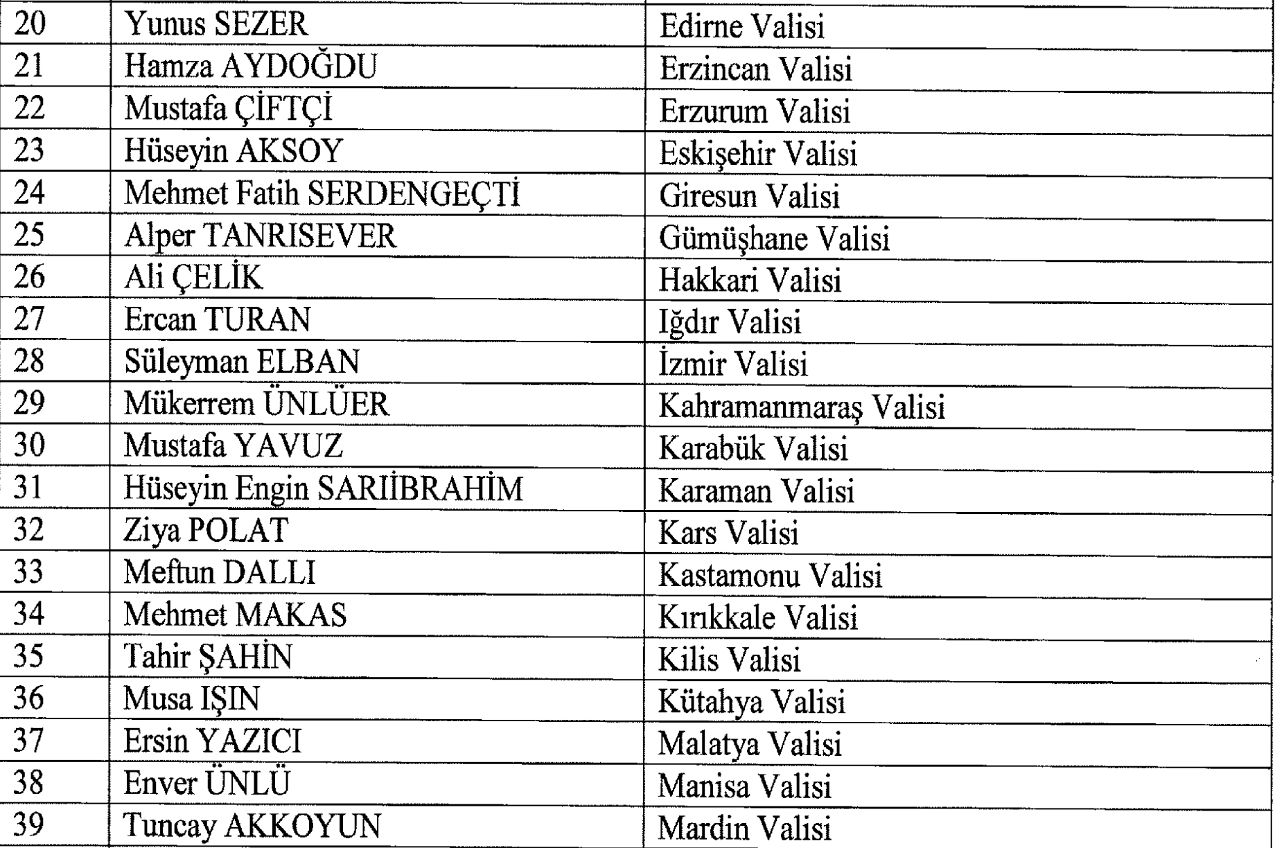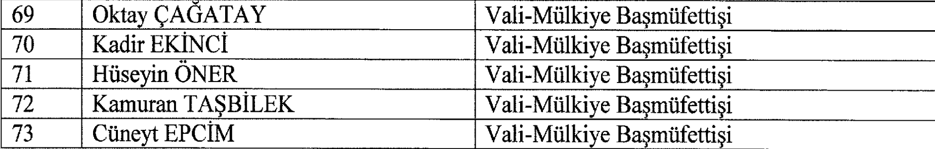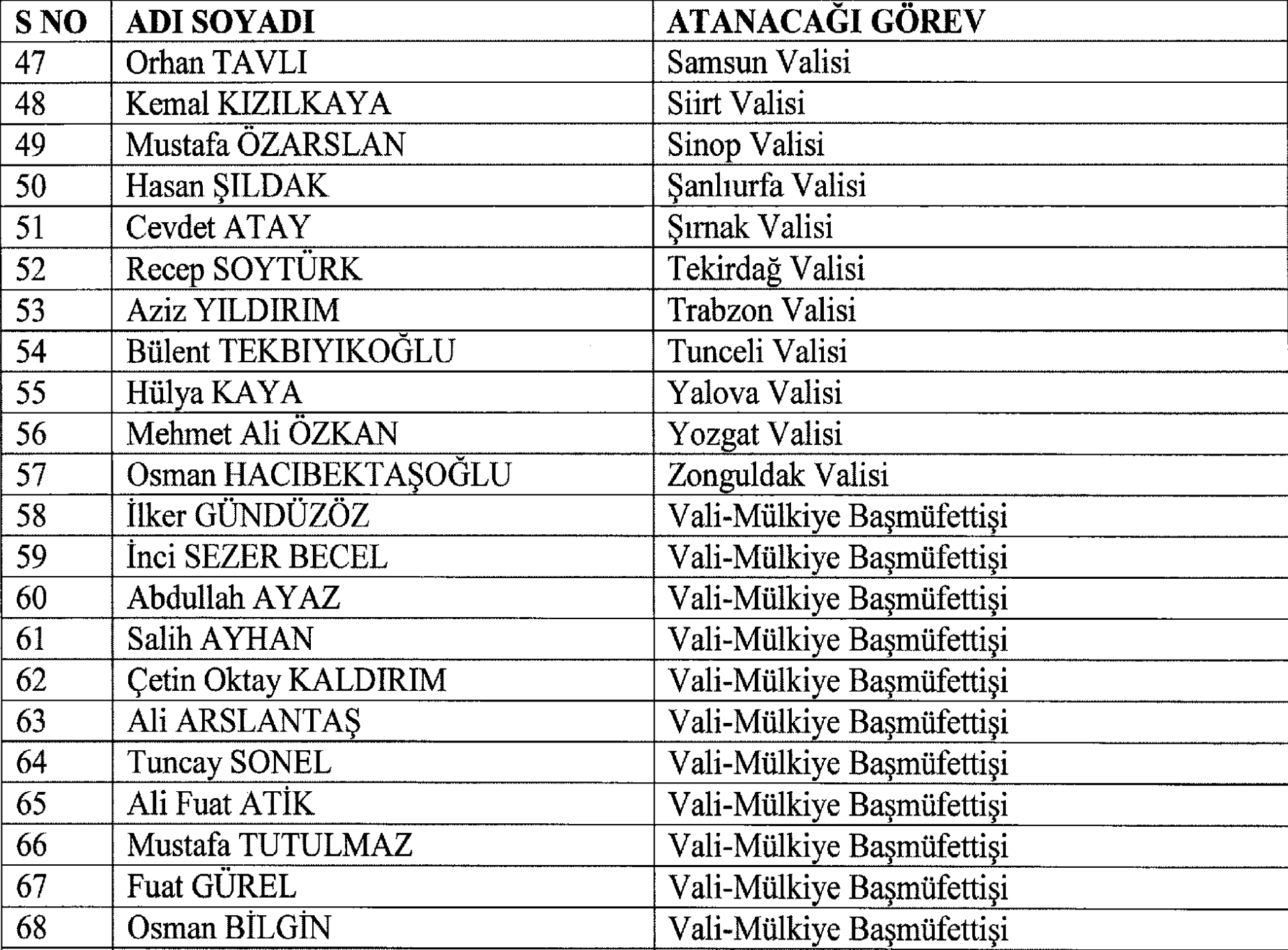 Kararnameye göre, İlker Gündüzöz, İnci Sezer Becel, Abdullah Ayaz, Salih Ayhan, Çetin Oktay Kaldırım, Ali Arslantaş, Tuncay Sonel, Ali Fuat Atik, Mustafa Tutulmaz, Fuat Gürel, Osman Bilgin, Oktay Çağatay, Kadir Ekinci, Hüseyin Öner, Kamuran Taşbilek ve Cüneyt Epcim "vali-mülkiye başmüfettişliği" görevine getirildi.