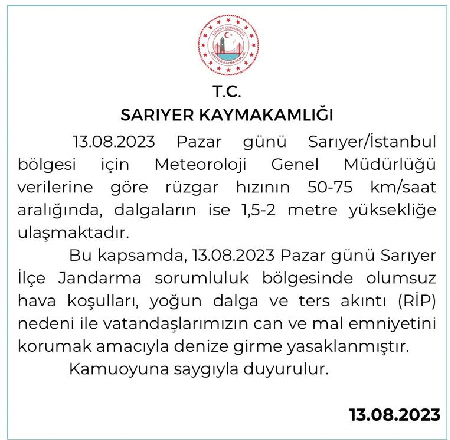 Sarıyer Kaymakamlığı'nın resmi sosyal medya hesabından yapılan açıklamada, "13.08.2023 Pazar günü Sarıyer İlçe Jandarma sorumluluk bölgesinde olumsuz hava koşulları, yoğun dalga ve ters akıntı (RİP) nedeni ile vatandaşlarımızın can ve mal emniyetini korumak amacıyla denize girme yasaklanmıştır" ifadeleri kullanıldı.