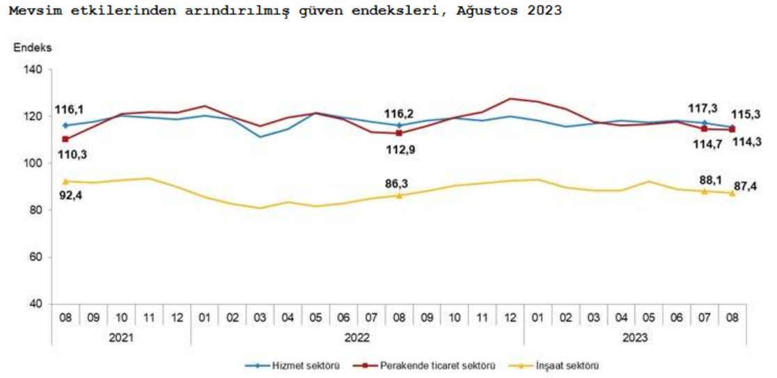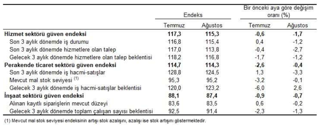 Buna göre, mevsim etkilerinden arındırılmış güven endeksi ağustosta aylık bazda hizmet sektöründe yüzde 1,7, perakende ticaret sektöründe yüzde 0,4 ve inşaat sektöründe yüzde 0,7 azalış gösterdi.