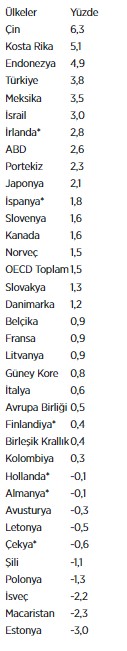 ECD ülkeleri arasında Kosta Rika, bu yılın nisan-haziran döneminde geçen yılın aynı çeyreğine göre yüzde 5,1 büyümeyle ilk sırada yer aldı. Bu ülkeyi yüzde 3,8 ile Türkiye, yüzde 3,5 ile Meksika izledi.