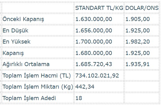Borsa İstanbul Kıymetli Madenler ve Kıymetli Taşlar Piyasası'nda (KMKTP), altında gerçekleşen toplam işlem hacmi 734 milyon 102 bin 21,92 lira, işlem miktarı ise 442,34 kilogram oldu.