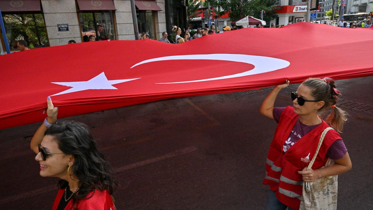 Gaziler, Anafartalar ile İkiçeşmelik caddelerinin ardından Cumhuriyet Meydanı'nda son bulan yürüyüşte İzmirliler, 350 metre uzunluğundaki dev Türk bayrağını birlikte taşıdı.