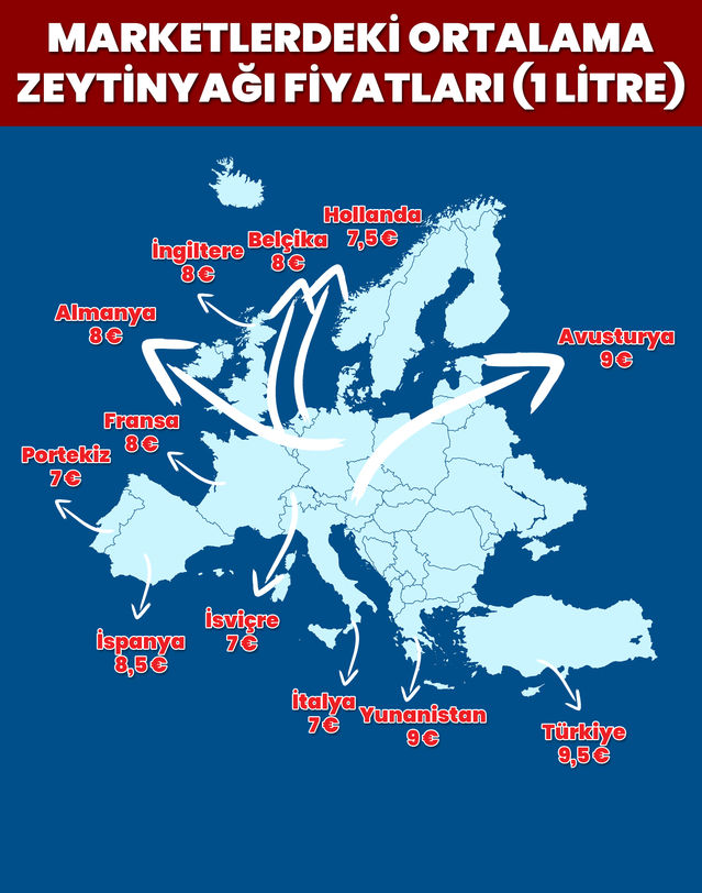 En büyük üretici olan İspanya'da 1 litre zeytinyağı yaklaşık 8,5 eurodan alıcı buluyor. Yunanistan'da ise litre fiyatı 9 euro civarında. Zeytinyağı üretiminde alt sıralarda bulunan Avrupa ülkelerinde fiyatlar şöyle: Hollanda 7,5 euro, Belçika 8 euro, Avusturya 9 euro, İsviçre 7 euro, Portekiz 7 euro, Almanya 9 euro, İngiltere 8 euro, Fransa 8 euro.