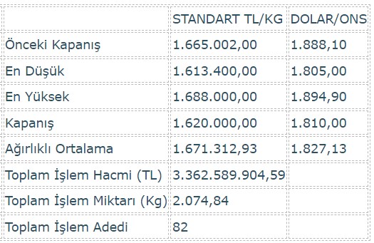Altın piyasasında, en düşük 1 milyon 613 bin 400 lira, en yüksek 1 milyon 688 bin lirayı gören standart altının kilogram fiyatı, günü önceki kapanışa göre yüzde 2,7 azalışla 1 milyon 620 bin liradan tamamladı.