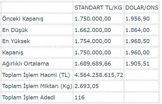 Borsa İstanbul Kıymetli Madenler ve Kıymetli Taşlar Piyasası'nda (KMKTP), altında gerçekleşen toplam işlem hacmi 4 milyar 564 milyon 258 bin 615,72 lira, işlem miktarı ise 2.693,05 kilogram oldu.
